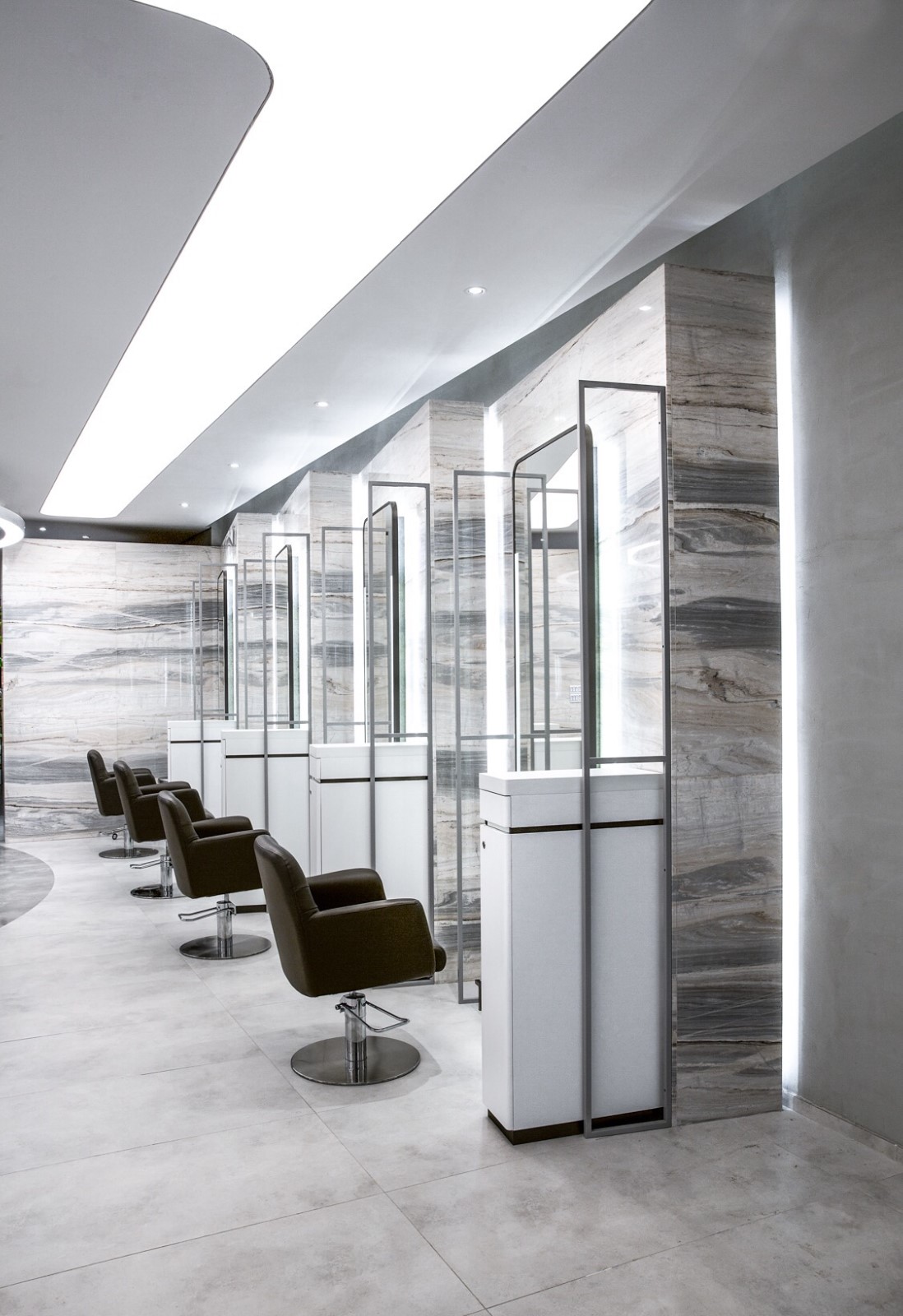 In the perimeter of the main area a touch of marble and soft colors define the cutting hair sections.